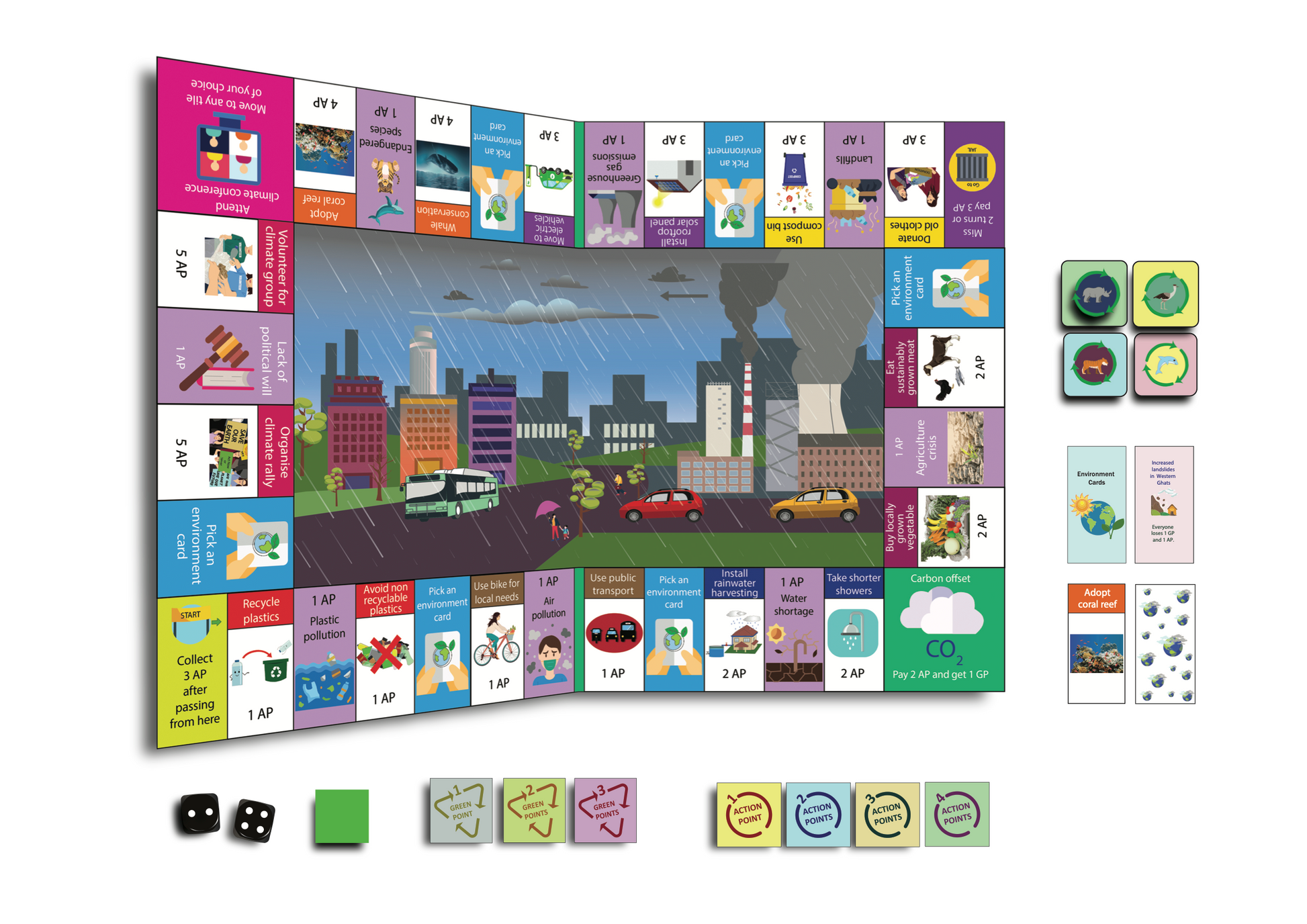 - Material kit with the entire board game, which includes the 1 Climaze board, 4 types of Action points (1AP, 2AP, 3AP and 4AP), 3 types of Green points (1GP, 2GP and 3GP), 2 Dice, 8 Green token, 4 Animal tokens, 16 Action cards and 18 Environment cards. All the materials required to play the game will be shipped to your home.
